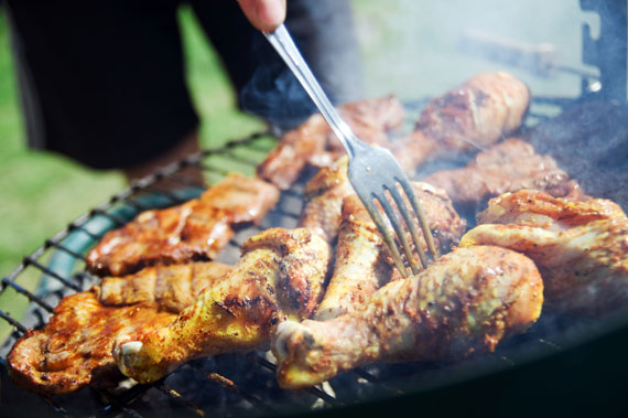- To check the doneness of chicken, pick one of the larger pieces from the grill and slice it open – if it is still pink, place back on the grill until all chicken legs/wings are done.